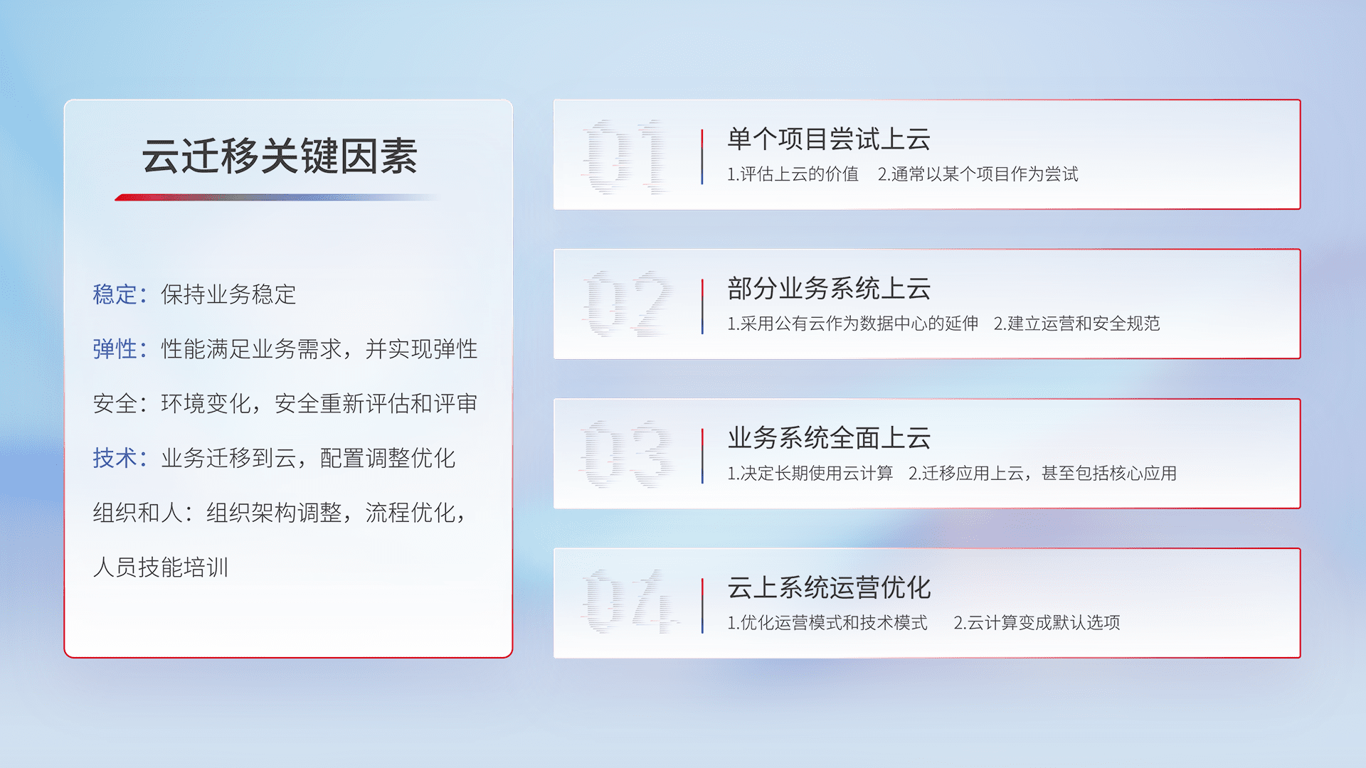 结合实际业务,,,,从规划设计、、、、云平台选型、、云原生改造、、、、数据迁移、、集成交付,,,,迁移全过程为客户识别最佳上云路径,,做好风险识别管理,,设计网络架构、、身份权限、、、安全审计合规、、、、操作审计、、、、日志审计、、、监控告警策略、、、、多站点容灾设计等,,,,对云上基础设施进行整体规划,,提升IT治理水平,,,以满足弹性、、高可用、、、高性能的需求。。