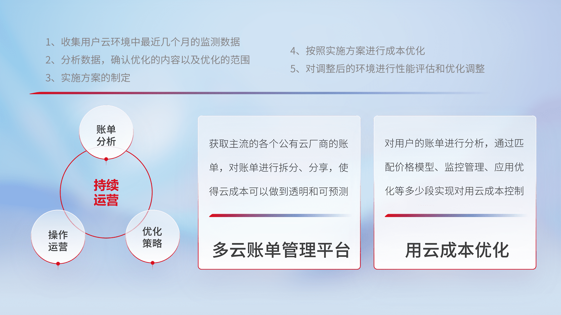 通过多云纳管,,,以统一的资源数据模型把客户的云资源进行抽象和封装,,进而实现对多云资源的统一操作,,,保障云资源管理的可靠性、、、、稳定性与可用性。。量身定制化运维内容,,,配置、、开发运维、、、、补丁管理、、、备份、、监控、、、认证和访问管理、、、、审计和日常巡检等,,保障在用云过程中的可靠度,,稳定度以及高可用率。。。。