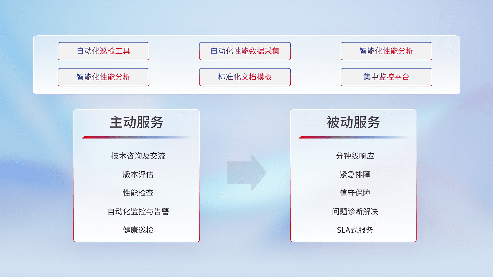 智能化工具和标准化文档,,保障服务质量,,,提供主动服务(包含技术咨询、、、、版本评估、、、、性能检查、、、自动化监控与告警、、、、健康巡检)和被动服务包含(分钟级响应、、紧急排障、、值守保障、、、、问题诊断解决、、、SLA服务)。。